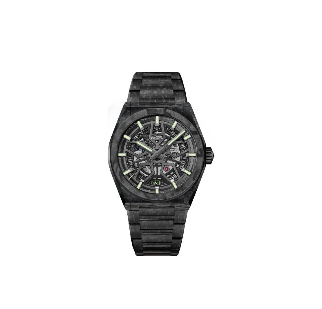The Zenith DEFY Classic Carbon is housed in a 41mm Black Carbon case, which is water-resistant to 100 m. The choice of black carbon is unusual in the traditional Swiss watchmaking industry. As a material, carbon fibre is lightweight yet strong, smooth to the touch, and exudes a futuristic, edgy appearance – indicating why it is a rare material to see in the time-honoured industry of horology. The entire watch, bracelet included, weighs only 65 grams, making it almost half the weight of its titanium sibling.