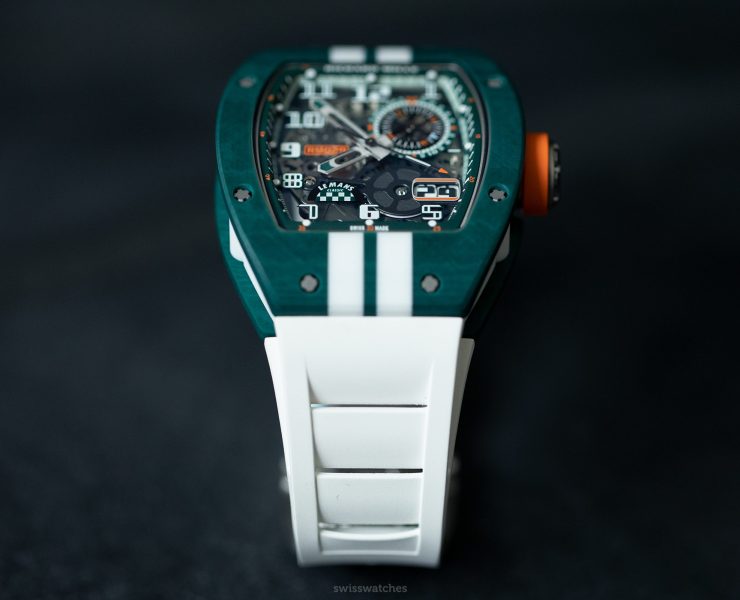 The case of the Longines Ultra-Chron Carbon is made from unidirectional carbon fibre and epoxy resin. This material is known for its strength and light weight, making it ideal for high-performance watches. The case measures 43 mm in diameter and has a cushion shape, reminiscent of the original 1968 model. The manufacturing process involves placing the carbon strips in a mould, heating them to high temperatures, and compressing them under high pressure. This creates random patterns in the carbon, ensuring that each case is unique. The watch weighs less than 80 grams, including the strap. It is water-resistant up to 30 bar (300 metres). The bezel is made of titanium with an aluminium insert, featuring a scale marked in increments of 10. The screw-down crown and case back are also in titanium, ensuring durability and corrosion resistance. A sapphire crystal with anti-reflective coating on both sides protects the dial and provides clear visibility from all angles.