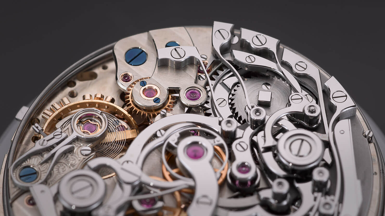 The first minute repeater was the above-mentioned Grand Complication in 2013. The manufacture calibre L1902 is still the most complicated wristwatch movement ever made by A. Lange & Söhne. It combines a perpetual calendar with moonphase display, a rattrapante chronograph with minute counter, a jumping second, and a striking mechanism with Grande Sonnerie, Petite Sonnerie, and a minute repeater. Altogether, the watch has three barrels: one for the timekeeping, one for the chronograph with jumping seconds, and one for the striking mechanism, which provides enough striking power for 24 hours. This movement consists of 876 parts and requires a high level of patience from the watchmaker. During assembly, any incorrect tone requires the entire movement to be disassembled to find the error. The model was limited to six pieces, whose production took several years. It showcased the full craftsmanship of A. Lange & Söhne. In 2015, the Zeitwerk followed as the first decimal minute repeater.