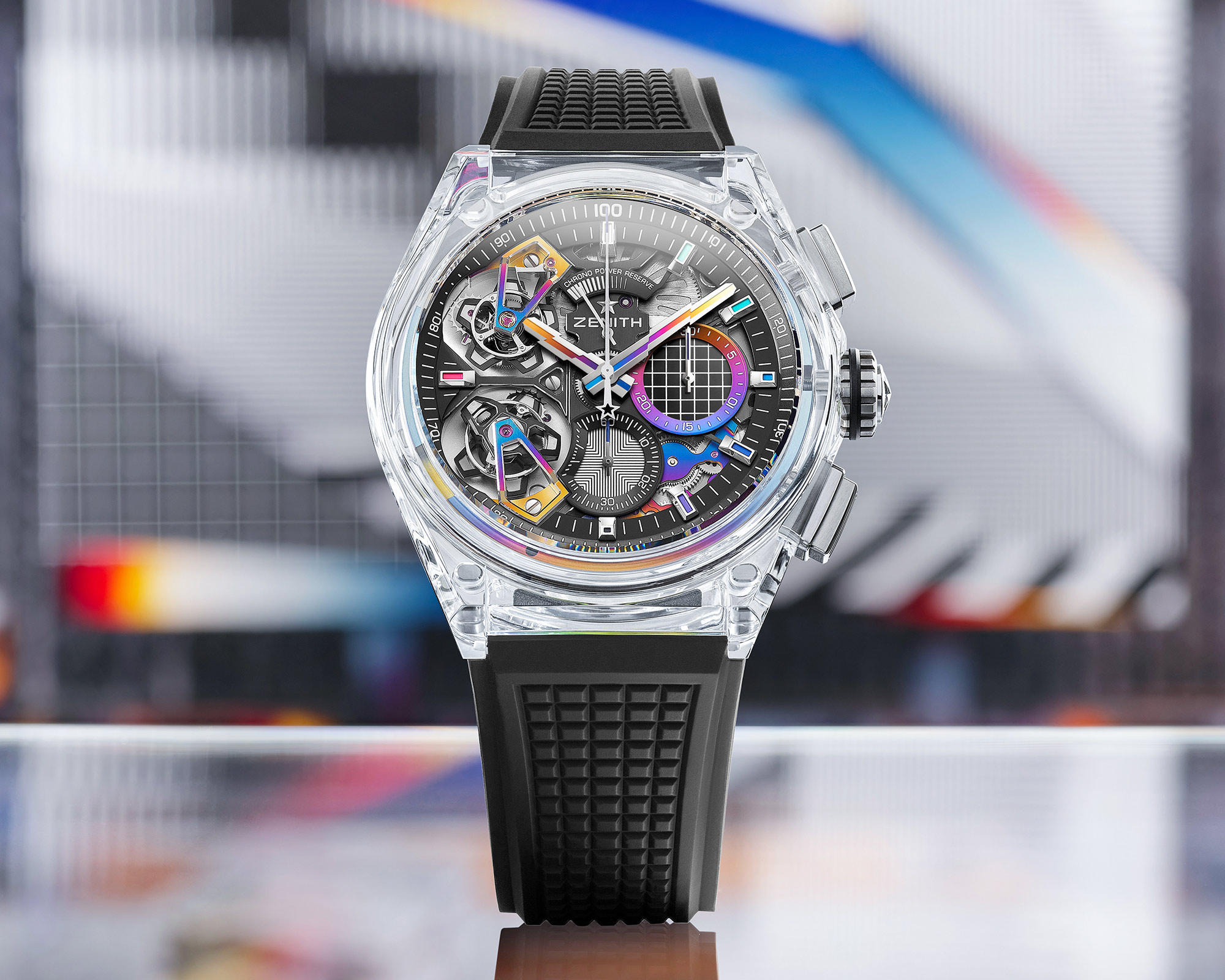 Whether by chance or not, the rainbow-coloured, PVD-coated bridges with the black laser-engraved main plate and the special oscillating weight are at least remotely reminiscent of the Rainbow model that celebrated great success 20 years earlier. No wonder, then, that there is a parallel series model of this truly remarkable watch, the Zenith DEFY 21 Felipe Pantone Chromatic, limited to 100 pieces.