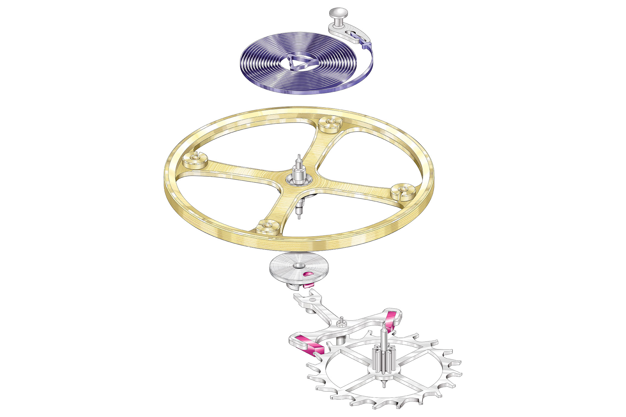 A classic steel escape wheel, pallet fork with pallets and balance wheel with Breguet hairspring.