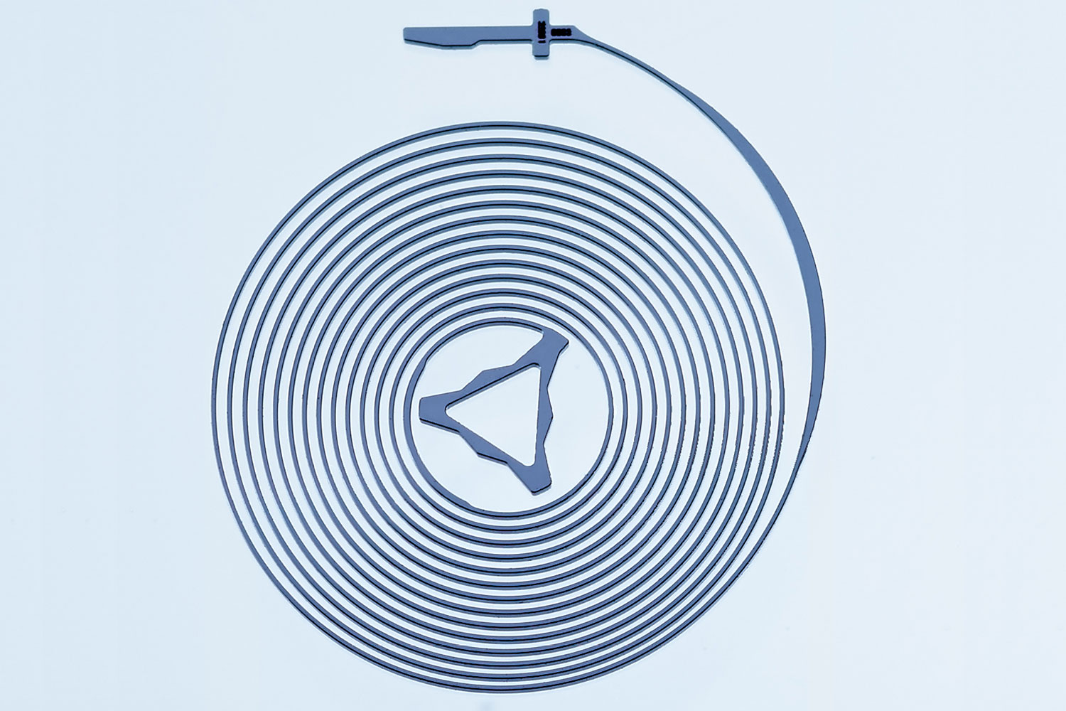 Because the new Patek end curve lies within the swing plane of the Spiromax hairspring, it is three times flatter than a hairspring with a bent-up end curve. For comparison, a conventional INVAR spiral with Phillips end curve is approximately 0.40 mm high. A conventional INVAR flat spiral is approximately 0.30 mm and the Spiromax spiral is only 0.12 mm.